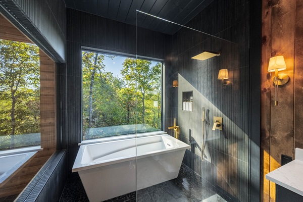 A bathroom designed to slow you down—natural light, calming colors, and a deep tub overlooking the trees. Pure Hochatown luxury. 🌿