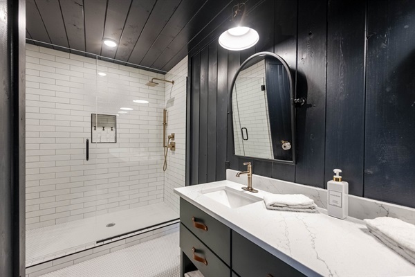 Designer tile adorns the large walk-in shower with rainfall shower head